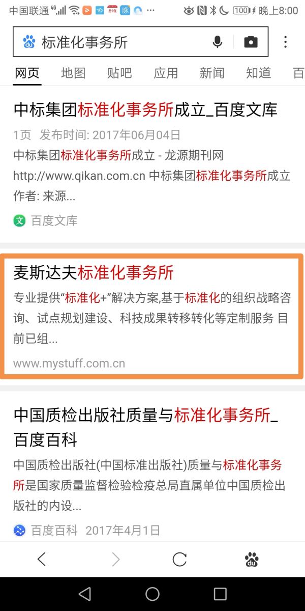 手機端百度搜索關(guān)鍵詞“標(biāo)準(zhǔn)化事務(wù)所”,麥斯達(dá)夫位于首頁排名第二位: